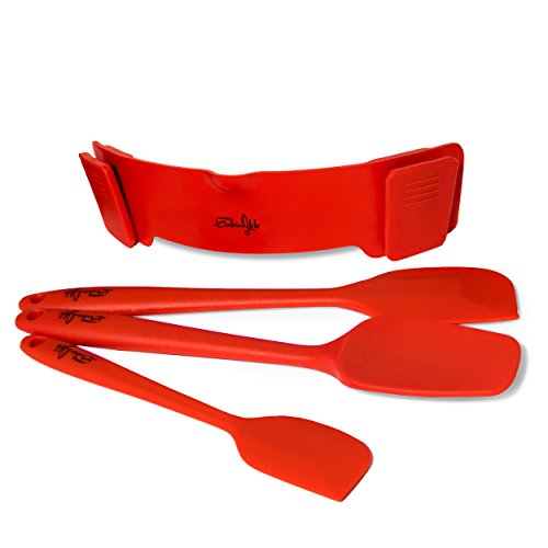SabinAble Red Silicone Clip On Kitchen Strainer With 3 Matching Baking Spatulas – 4 Piece Set