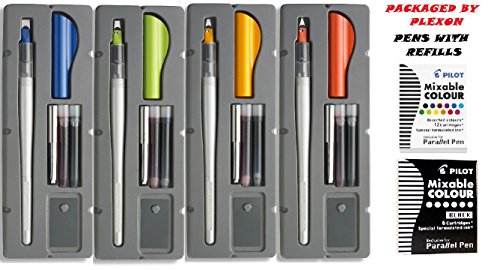 - Each set comes with 4 Parallel pens: Available in 4 nib sizes: 1.5mm (Red Cap) 2.4mm (Orange Cap) 3.8mm (Green Cap) and 6.0mm (Blue Cap)