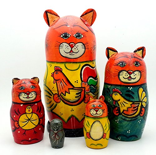 -. Title : Cat and rooster nesting dolls Russian Hand Carved Hand Painted 5 piece matryoshka Set