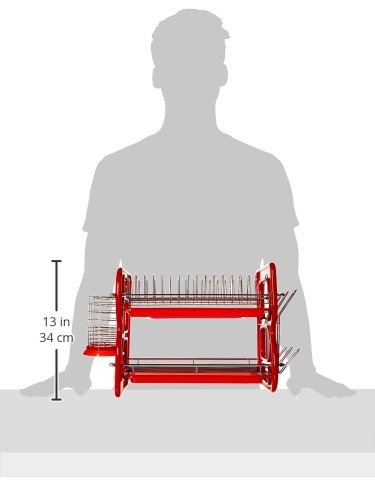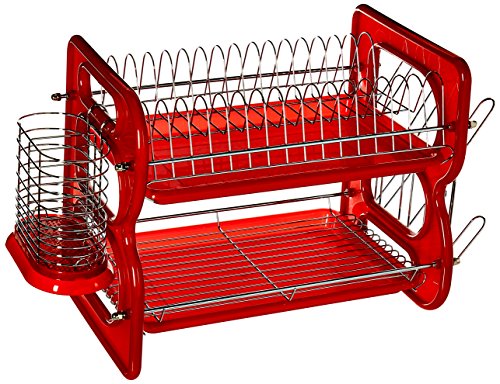 EuroWare Heavy Duty Plastic Chrome Plated Steel Large 2 Tier Dish Drying Rack with Trays, Cutlery and Cup Holder, 22 Inches, Red