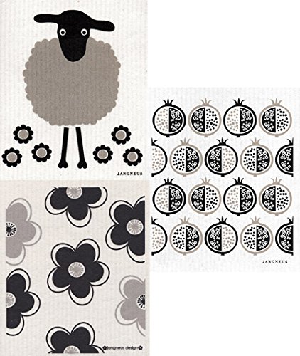 Swedish Dishcloths - Set of 3 (AB) BLACK Sheep, Flowers, Pomegranate