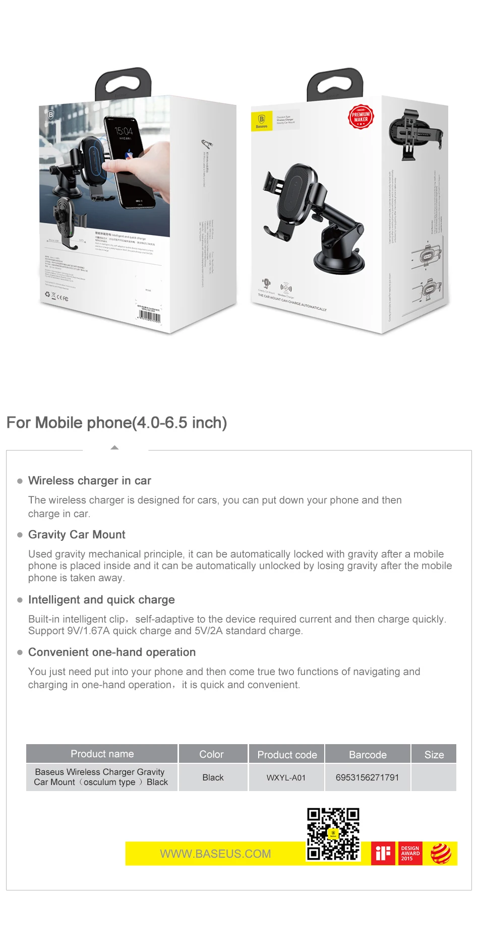 Model Number:Baseus 2-in-1 Wireless Charger Car Mount Phone Holder With Micro Cable