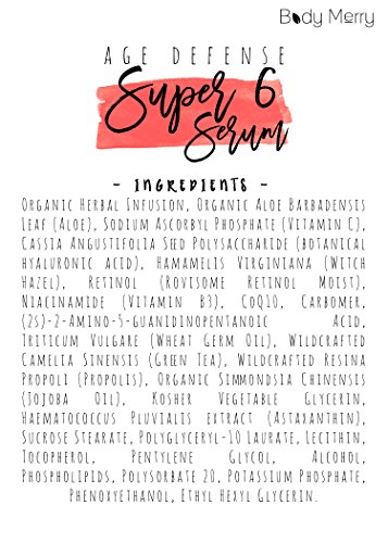 HAVING A HARD TIME PICKING THE BEST VITAMIN C SERUM OUT THERE? Don't make the mistake of choosing a generic 20% vitamin c serum. Body Merry's Age Defense Super 6 Serum's customized formula uses the most powerful ingredients out there. With 22% Vitamin C, we also packed in other POWERFUL INGREDIENTS like Hyaluronic Acid, Niacinamide, CoQ10, Retinol and Astaxanthin to make this the MOST IMPRESSIVE SERUM you'll find.