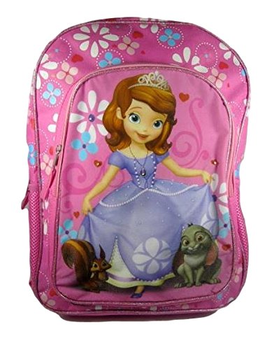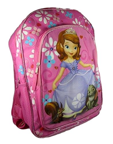 This adorable backpack features 4 flashing lights on front of pack, one being the gem on Sofia's necklace. Durable for lots of use. 2 mesh side pockets. Glitter and shimmer front details. Removable name tag on back.