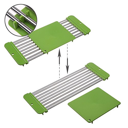 - ✔ STAINLESS STEEL DRAINING RACK: the non-rust and uncoated stainless steel with the durable grip silicone provide an easy cleaning solution when it is dirty, just wipe it with cloth, modern look for your kitchen and perfect spacing-saving design, easy for air-drying washed dishes, vegetables and fruits