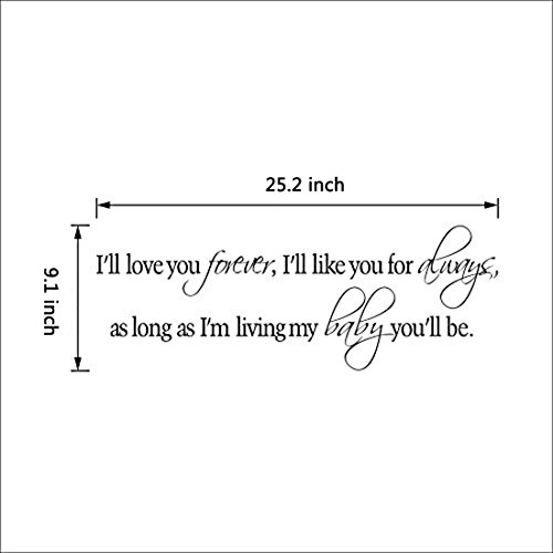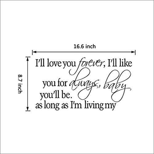 -. Binding : Kitchen -. Brand : Witkey -. Color : Black -. EAN : 6726889770158 -. Feature : Material: Vinyl / Package: Roll Package / Easy to install and remove / Handcraft! Wall decals sticker with high definition / Easy to Apply, Removable, Durable, Pressure Resistance, Shock Resistance, Moisture Resistance. -. Label : Witkey -. Manufacturer : Witkey -. ProductGroup : Home -. ProductTypeName : HOME -. Publisher : Witkey -. Studio : Witkey -. Title : Witkey I'll Love You Forever I M Living My Baby You'll Be Diy Home Decor Decals Wall Sticker Art Quote and Saying Removable DIY Mural Living Room Bedroom