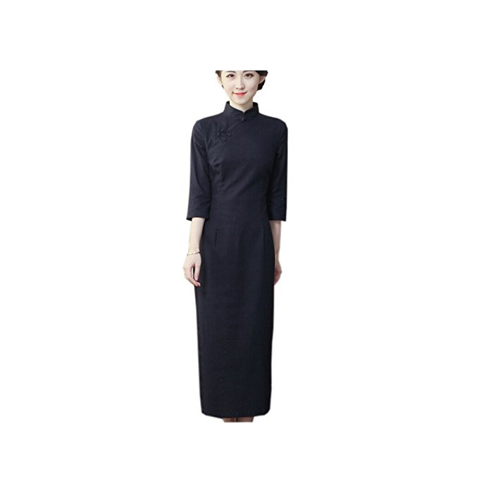 붙어 연꽃(향기백련) Yuelian(TM)차이나 드레스 롱 긴 소매 무지 차이나복 여성 원피스 파티 드레스 중화 옷 망년회 발표회 (XL:옷 길이111cm 어깨 폭39cm 바스트98cm,2 블랙
