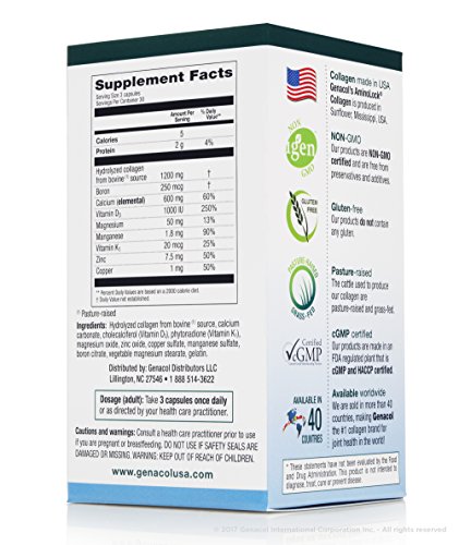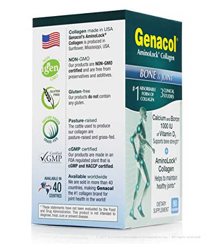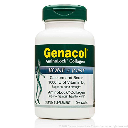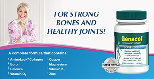 Genacol Bone & joint is a natural supplement contains calcium, vitamin D3 and boron, an innovative ingredient that optimizes the absorption of calcium Only Genacol products contain AminoLock Collagen with efficacy that has been demonstrated by three conclusive clinical studies. Boron (250 mcg); Calcium (600,0 mg); Copper (1 mg); AminoLock® hydrolysed collagen from bovine source (1200 mg); Magnesium (50 mg) ; Manganese (1,8 mg) ; Vitamin D3 (25 mcg); Vitamin K1 (20 mcg) ; Zinc (7,5 mg) osteoporosis prevention women health Pasture-Raised, Grass-Fed Collagen Peptides