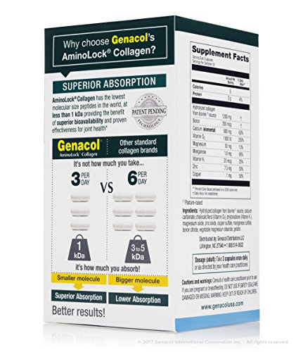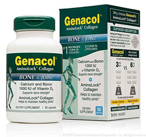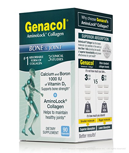 SUPERIOR ABSORPTION AND BIOAVAILABILITY FORMULA: Optomized calcium absorption with Genacol Bone & Joint Unique blend of Calcium Boron and Vitamin D3. Also Genacol's AMINOLOCK hydrolyzed collagen with the LOWEST MOLECULAR WEIGHT on the market offers superior bio-availability and Absorbability for proven effectiveness for joint health support.