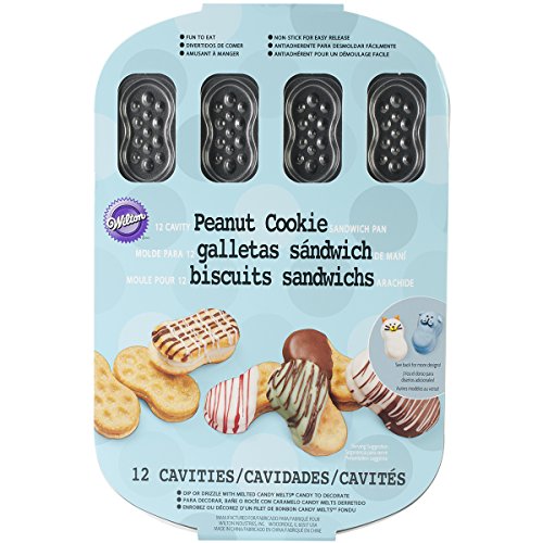 Wilton-Cookie Pan: Dippers. Create delicious peanut butter sandwich cookie's in this non-stick cookie pan! This package contains one 11-1/2x7-1/2x1/4 inch cookie pan with twelve peanut cavities. Imported.