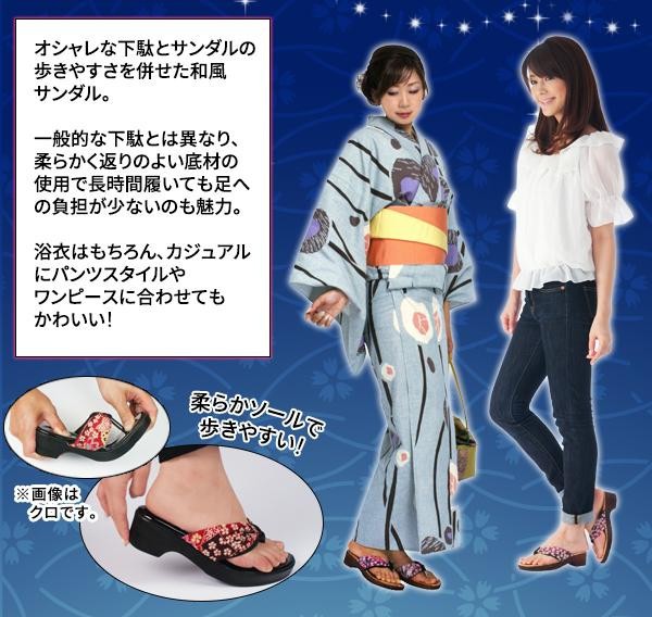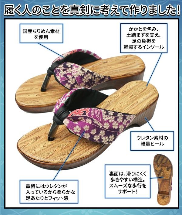おしゃれな下駄とサンダルの歩きやすさを併せ持った和風のサンダルです。一般的な下駄とは異なり、柔らかいウレタン素材を使用している為、軽くて長時間履いても足への負担が少ないのが魅力!!鼻緒は国産ちりめん素材を使用。浴衣にも、普段のカジュアルな服装にも、可愛く合わせて頂けます。 |