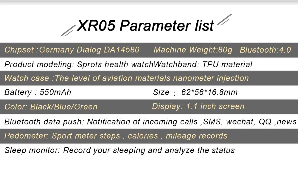 Function:Remote Control,Month,Push Message,Passometer,Message Reminder,Sleep Tracker,Altitude Meter,Call Reminder,Fitness Tracker