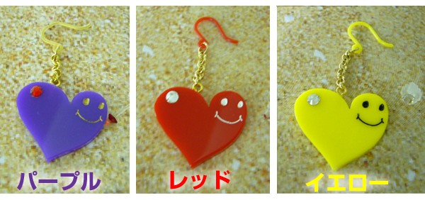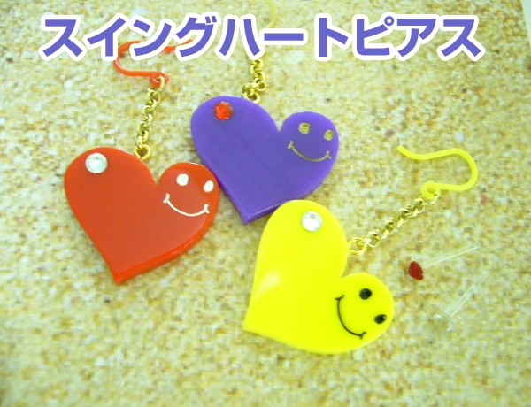 | ●ハートの横にスマイル君の顔が入ってるよ | | ●片耳はハート、もう一方はスワロフスキー、とデザインが違います! | | ●アレルギーの人も安心の樹脂ポスト&キャッチ |