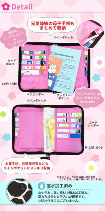 たくさんのポケットやカードホルダーでしっかり収納☆収納力バツグンな母子手帳ケースです。たくさん入れてもふっくらフォルムできれいに収まります。母子手帳だけでなく、通帳や文庫本などもピッタリ入るサイズなのでマルチケースとしても使える♪撥水加工を施しているので、汚れてもお手入れがカンタンです。 |