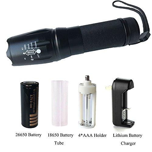 Full Kit Includes: Super Bright Professional Grade Tactical LED Flashlight + 1 High Quality 26650 Rechargeable Lithium Ion Battery + 1 Lithium Battery Charger + Case + 1 AAA Battery Holder + User Manual.Suitable As A Gift.