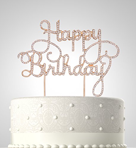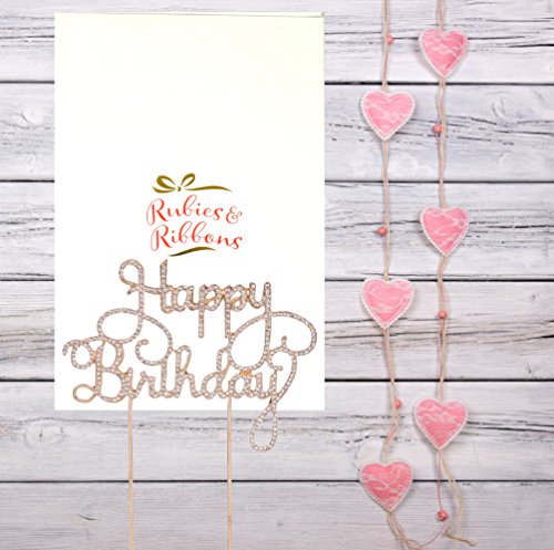 Rubies & Ribbons "Happy Birthday" Gold Metal with Rhinestones Birthday Cake Topper Party Decoration with Gift Box
