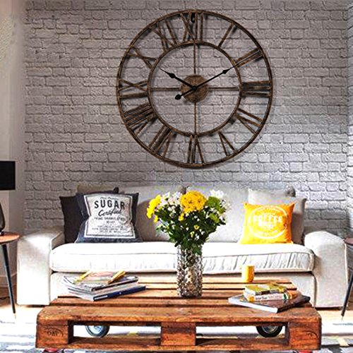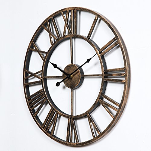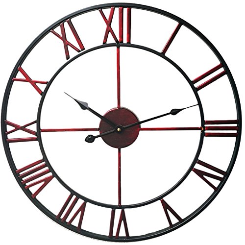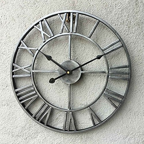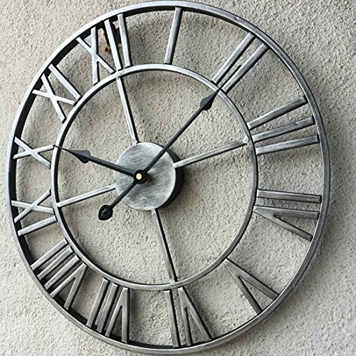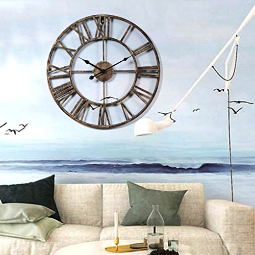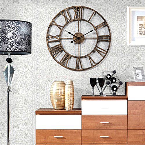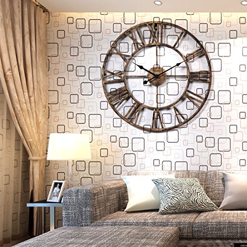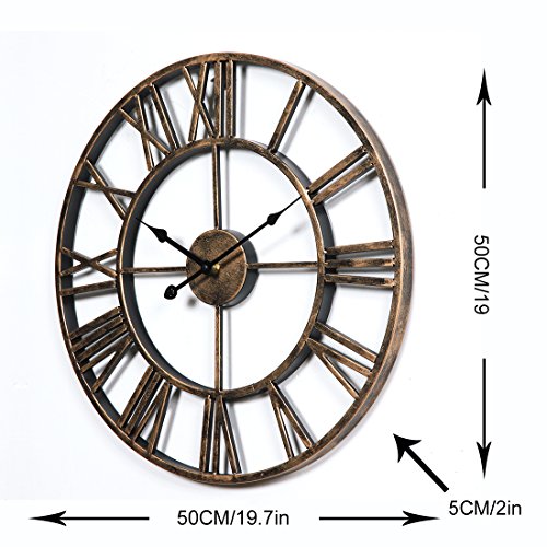 -. Feature : 20-inch wrought iron wall clock is sturdy and durable;exquisite workmanship keep the clock with a long time use. / Hollowed-out with roman numeral numbers make it easy to read; 1*AA battery operated(Not Included). / Oversize wall clock is fashion and durable, easy to hang onto the wall, and convenient to use. / Combination of traditional and modern technology,is suitable for various furnishing style. / Vintage decorative Clock is perfect for cafes, club, pub, bar, hotel,garden, bedroom, living room decoration.