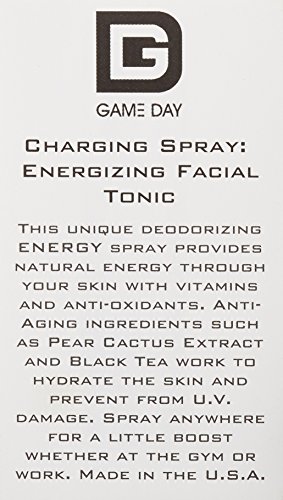 Studio : Game Day Skincare Publisher : Game Day Skincare Binding : Health and Beauty Product Description This unique deodorizing energy spray provides natural energy through your skin with vitamins and anti-oxidants. Anti-aging ingredients such as pear cactus extract and black tea work to hydrate the skin and prevent from u.V. Damage. Spray anywhere for a little boost whether at the gym or work. Blended from natural ingredients to be paraben and cruelty free. Made in the u.S.A. 0