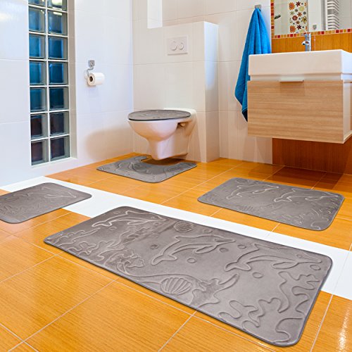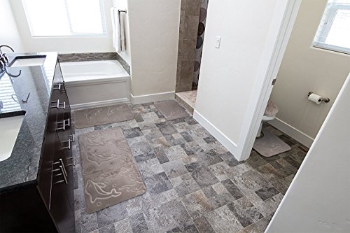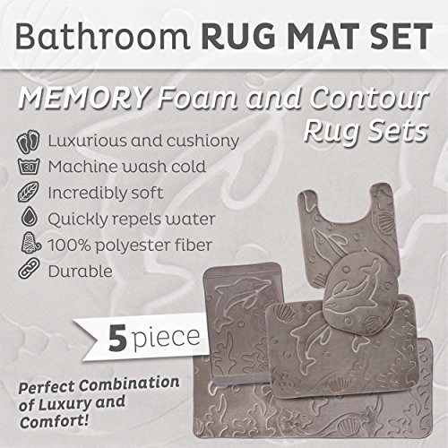 Studio : Elvoki Publisher : Elvoki Product Description Get 5 Piece Memory Foam Bathroom Rug Set For your Comfort: Runner Bath Mat 22" x 47", 1 Rug 19" x 30.5", 1 Rug 17" x 24", 1 Contour Rug 20"x20.5", 1 lid cover (16"x14") Great for Larger bathrooms. Machine wash cold, tumble dry low or lay flat to dry Luxurious and cushiony, this bath rug is constructed of 100% polyester fiber that's incredibly soft and durable.The top material also quickly repels water, allowing the polyester yarn to quickly wick away excess moisture. 0