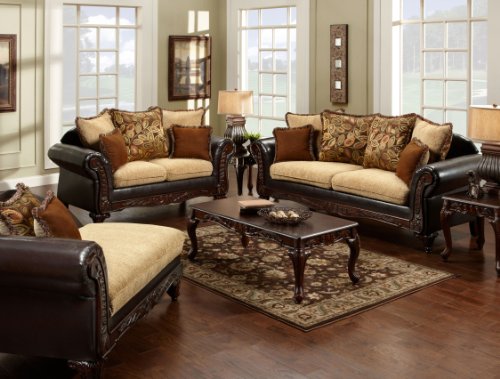 - Intricate wood carvings along trim accentuate sleek lines and rolled arms