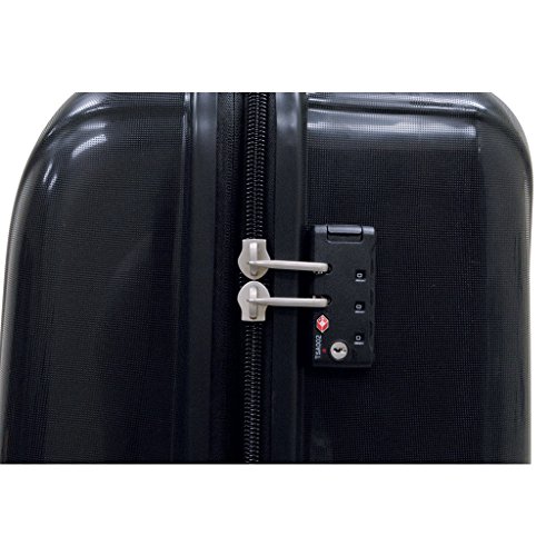 Studio : Samboro Luggage Canada Corporation Publisher : Samboro Luggage Canada Corporation Product Description Constructed from 100% Polypropylene with non-scratch finish. The four 360° rotation wheels assure effortless multi-directional rolling. Fully lined interior with divider, retaining strap and mesh pocket. Recessed locking Trolley handle with aluminum tube. Self-repair zipper. Expandable up to 2 inches. TSA combination lock.Type: Carry On, UprightMaterial: Polypropylene, Mesh, AluminumPattern: SolidFeature: Expandable, Spinner, Telescoping HandleExact Color: BlackColor: Black 0