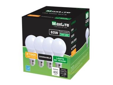 Maxlite - (4-Pack) 9A19DLED27/G4/4P 9 Watt Omnidirectional LED A19 Dim. 2700K