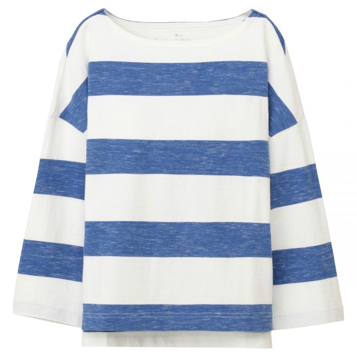 Muji 오거닉 코튼태 번째 드롭 숄더T셔츠(스치 조) 부인XS~S흰색×블루(스쳐라굵다)SALE