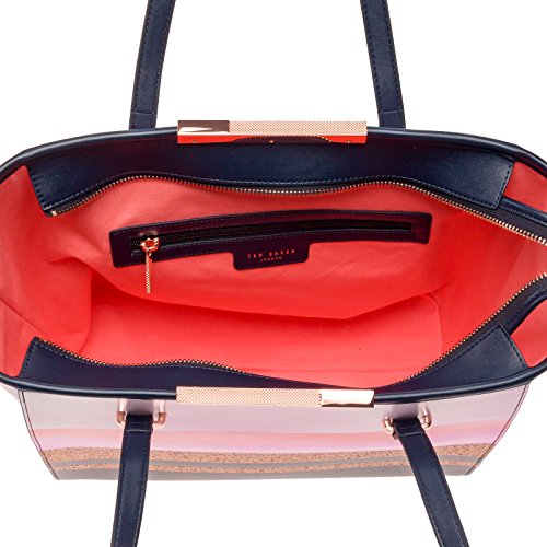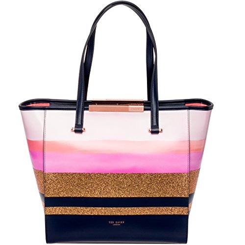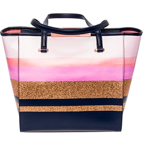 Product Description Looking for an elegant way to carry all the necessities? Look no further than the Miaaa Tote by Ted Baker. This chic tote features glittery stripes along the exterior, with rose gold-tone detailing to complete the look. The spacious interior compartment can hold all the necessities and features two slip pockets and a zip pocket to keep you organized. Measures 11.5" x 11.5" x 6" with a 9" strap drop. 0