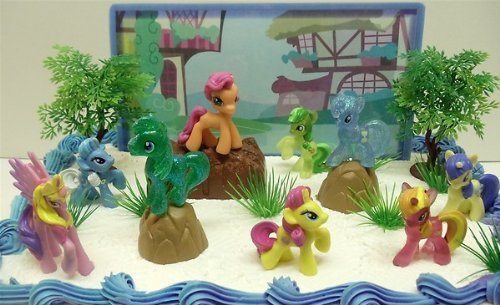 MY LITTLE PONY BIRTHDAY CAKE TOPPER FEATURING 10 RANDOM MY LITTLE PONY CHARACTERS, TREES, BOULDERS, BACKDROP AND OTHER THEMED DECORATIVE CAKE PIECES