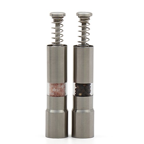 6-inch push-button salt and pepper grinders; operate each mill with just 1 hand^Sleek stainless-steel casing and clear windows to see salt and peppercorns^Modern design adds style to a contemporary kitchen^Solid and durable construction for long term use^Backed by Limited Lifetime warranty