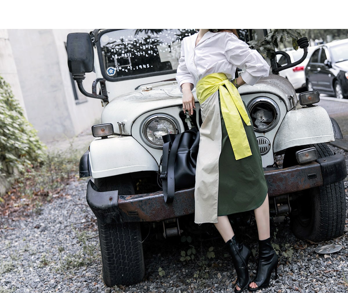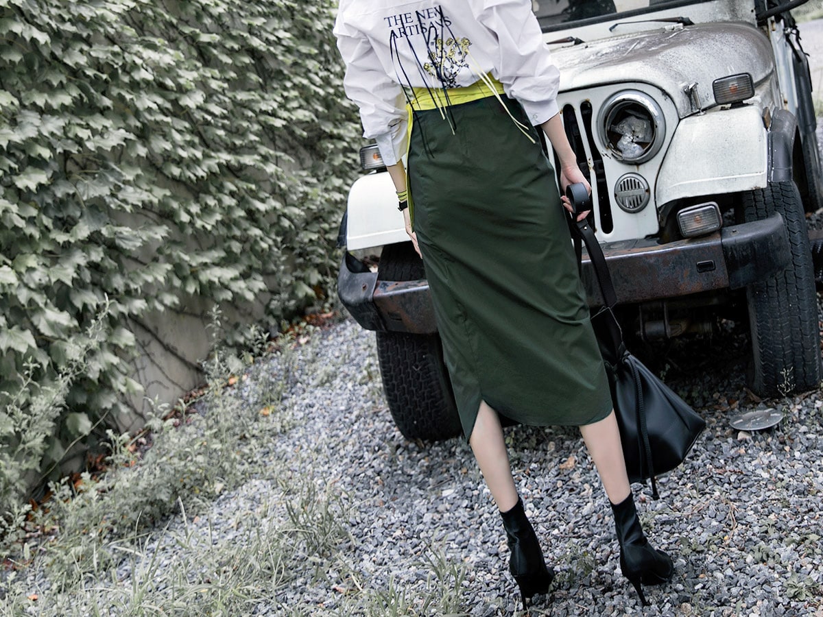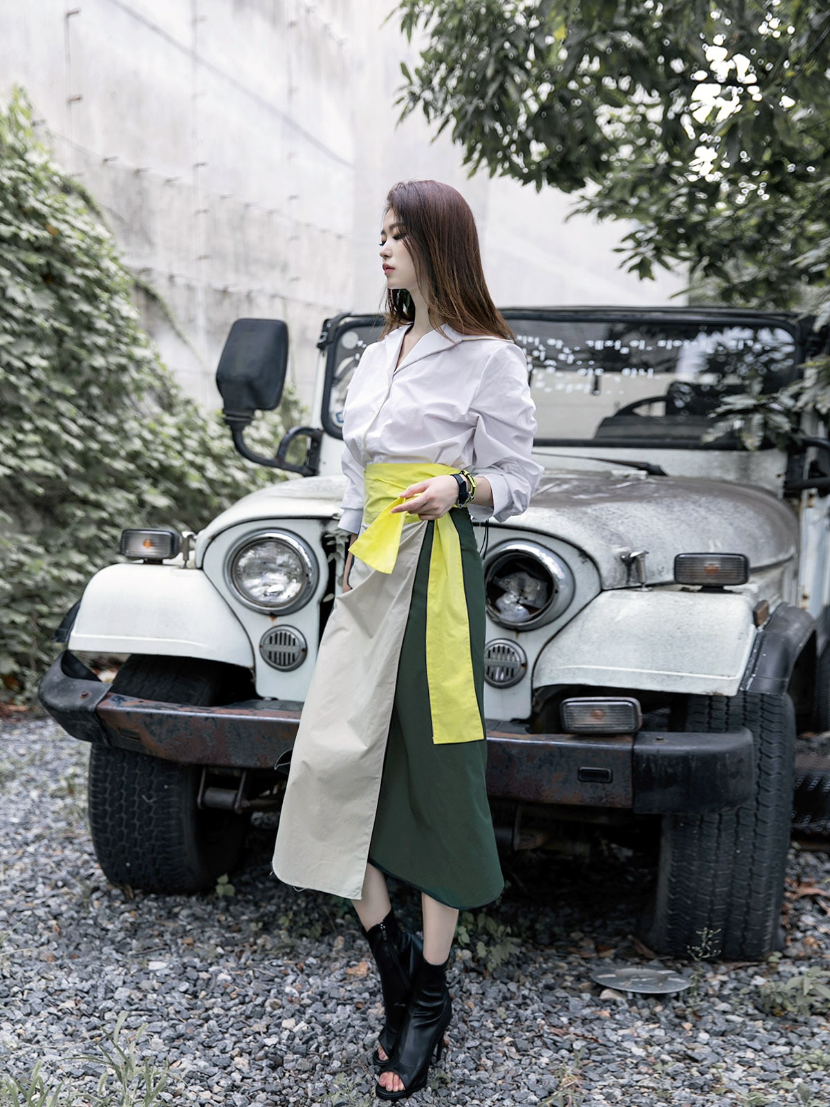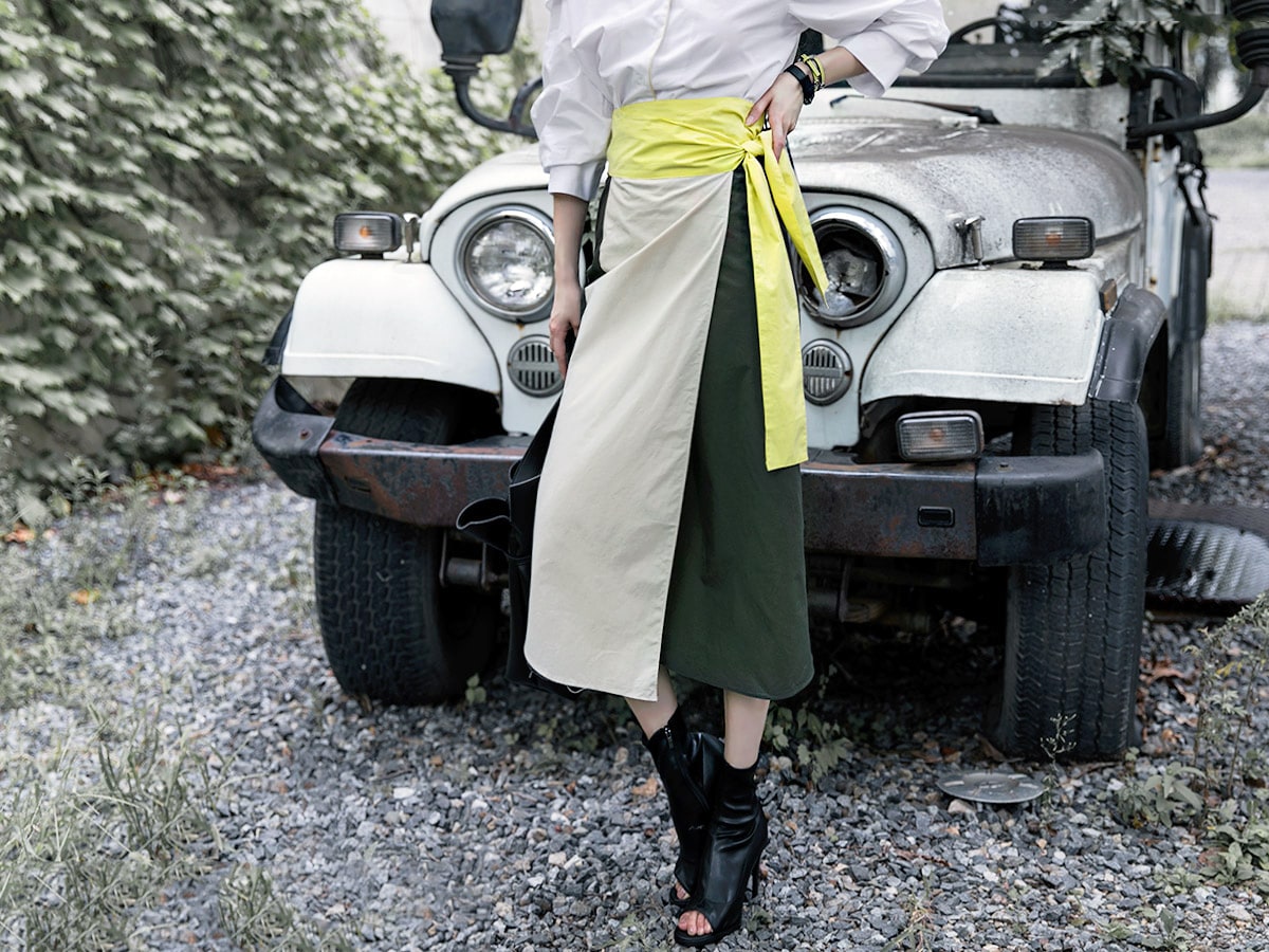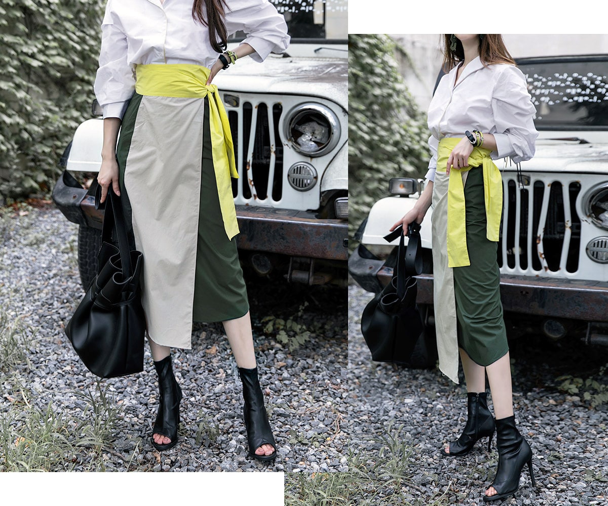 SK1770 유니크 배색 랩 언발 스커트 Khaki mix