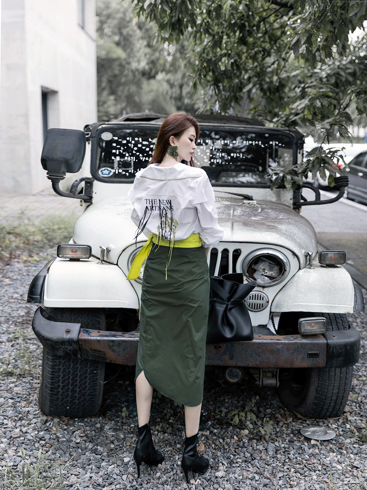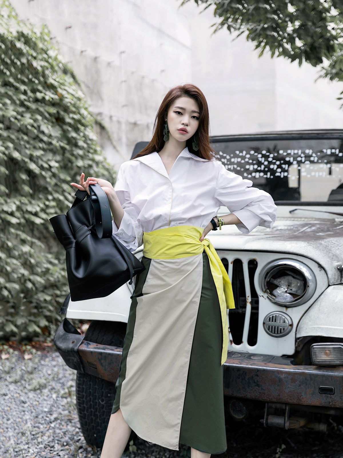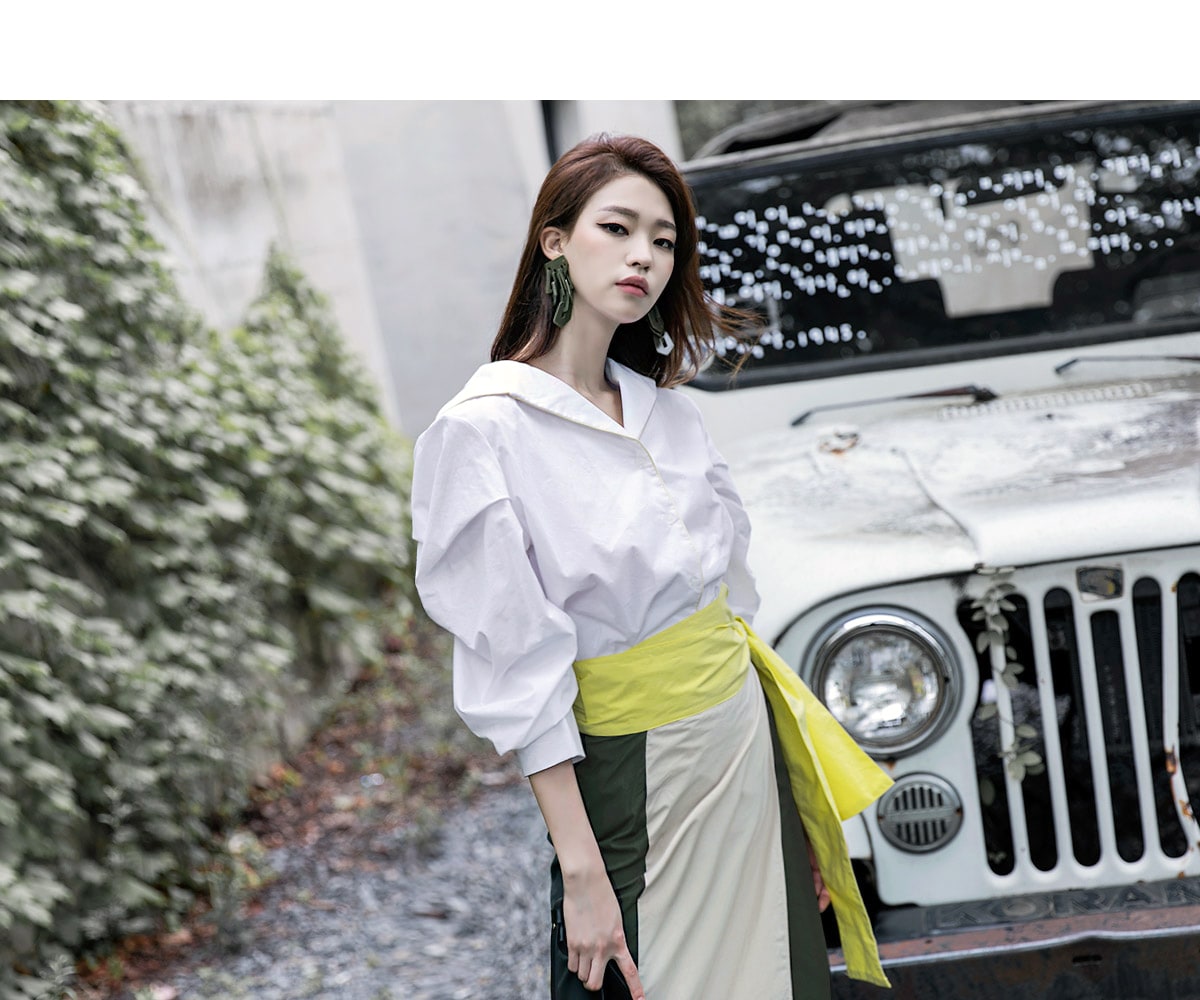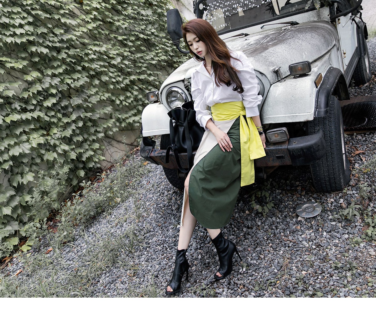 SK1770 유니크 배색 랩 언발 스커트 Khaki mix