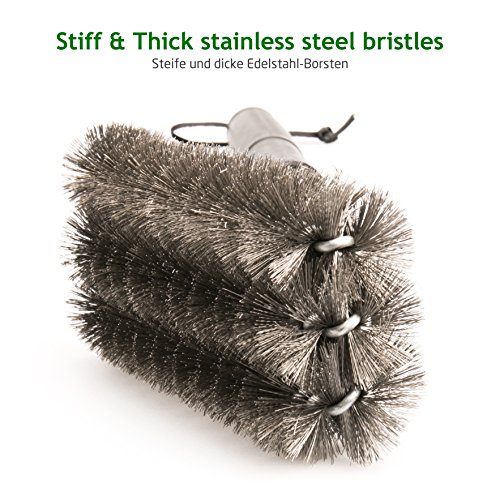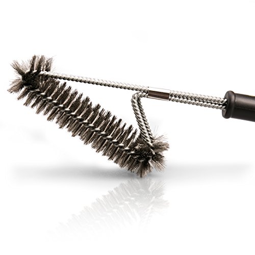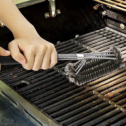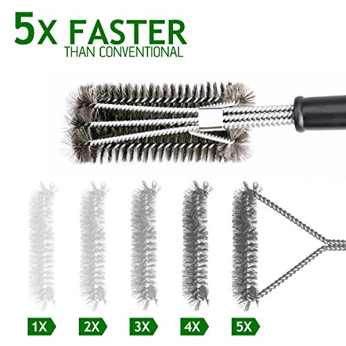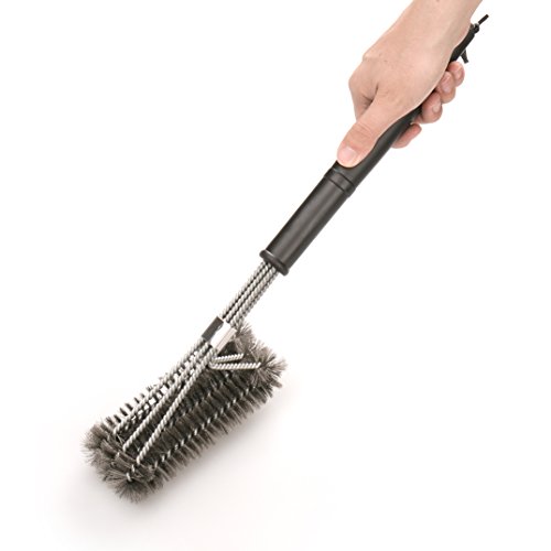THREE THICK BRUSHES for more effective and uniform pressure (longer lasting bristles) on grill grate.