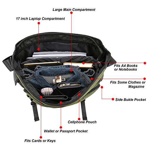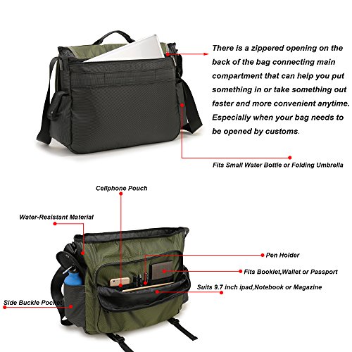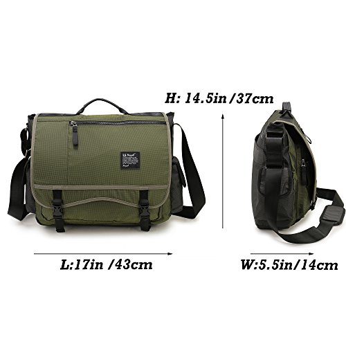 -. Feature : Material: Lightweight & Water Resistant Nylon Material. The stitching is strong and the material itself is thick but not bulky. It fits laptop up to 17-Inch. Bag Dimension: 17 L*5.5 W*14.5 H inches. / High Quality &Stylish & Functional: This bag has a separate interior providing a divider to keep all other items safely away from the laptop meanwhile leaves enough room to carry anything. Also it is pretty roomy and can easily hold a laptop, tablet, power cord, wallet, clothes, a couple of books, and few more miscellaneous items. But it is very easy to find and retrieve things. / Padded Carrying Top Handle: It has a top handle to make it easier to grab the bag before putting on the shoulder strap or when you're just picking the bag up. It's convenient to put the bag in the car and getting it out with handle to grab quickly. Besides, top handle makes it easier to grab the bag (from under an airline seat). / Specially Designed & Important Feature: There is a zippered opening on the back of the bag connecting main compartment that can help you put something in or take something out faster and more convenient anytime.( Especially when your bag needs to be opened by cus) / Usage & Occasions: The bag can be carried by the handle, worn on shoulders, positioned across body, also hold on the Trolley Case. Perfect in every day, working, office, airline travel, city tour, music festival, high school, college.