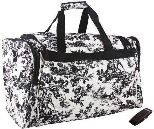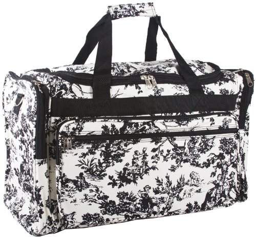 -. Brand : World Traveler -. Department : womens -. Feature : Adjustable, detachable non-slip padded shoulder strap / U-top opening provides easy access to roomy zipper secured main compartment / Metal feet allows stabiity to bag when setting down and provides bag floor not to touch floor directly to get dirty / Front exterior zip pocket with two exterior end zip pockets / Silver pewter hardware -. NumberOfItems : 1 -. PackageQuantity : 1 -. ProductGroup : Apparel -. ProductTypeName : LAGE -. Title : World Traveler Toile Collection Travel Duffle Bag