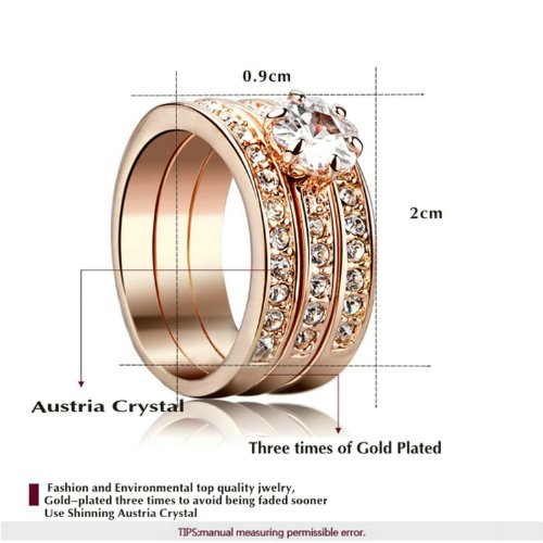 - Feature : This trinity ring is decorated with beautifully crafted Austrian crystals which sparkle gracefully and beautifully. / Three layers of 18K rose gold plated, nickle free and comfort fit. / It's a perfect fashion accessory to complement your wardrobe or as an appropriate gift used in wedding and engagement party or other occasions. / The width is 0.35'' and the diameter of the ring is 1''. / Shipped out in an exquisite jewelry gift box. Delivery time 7-15 days. One year warranty.
