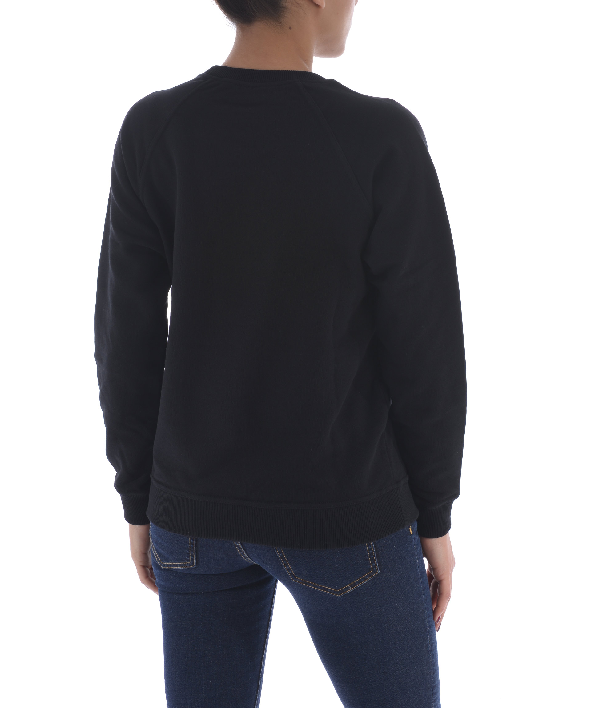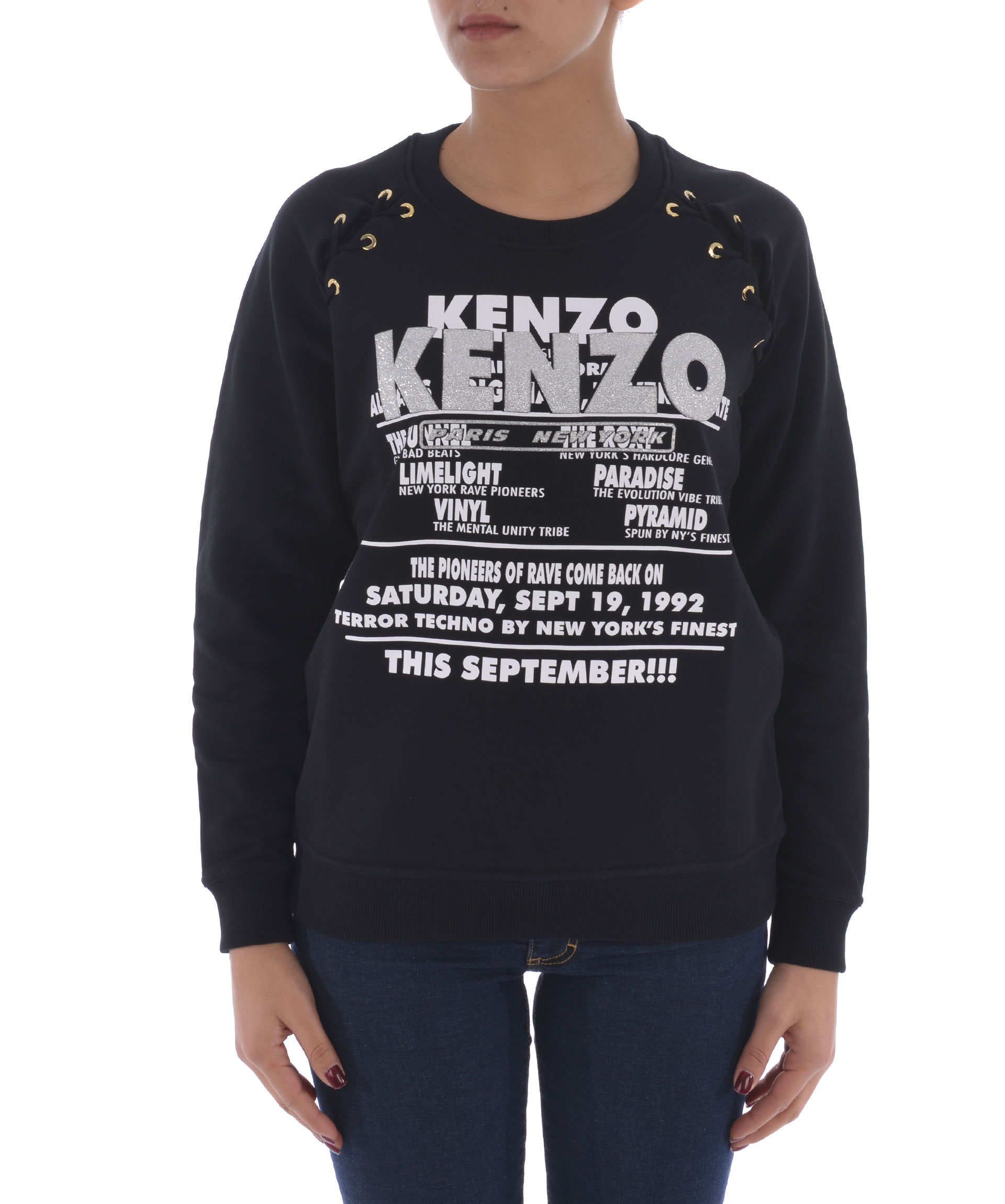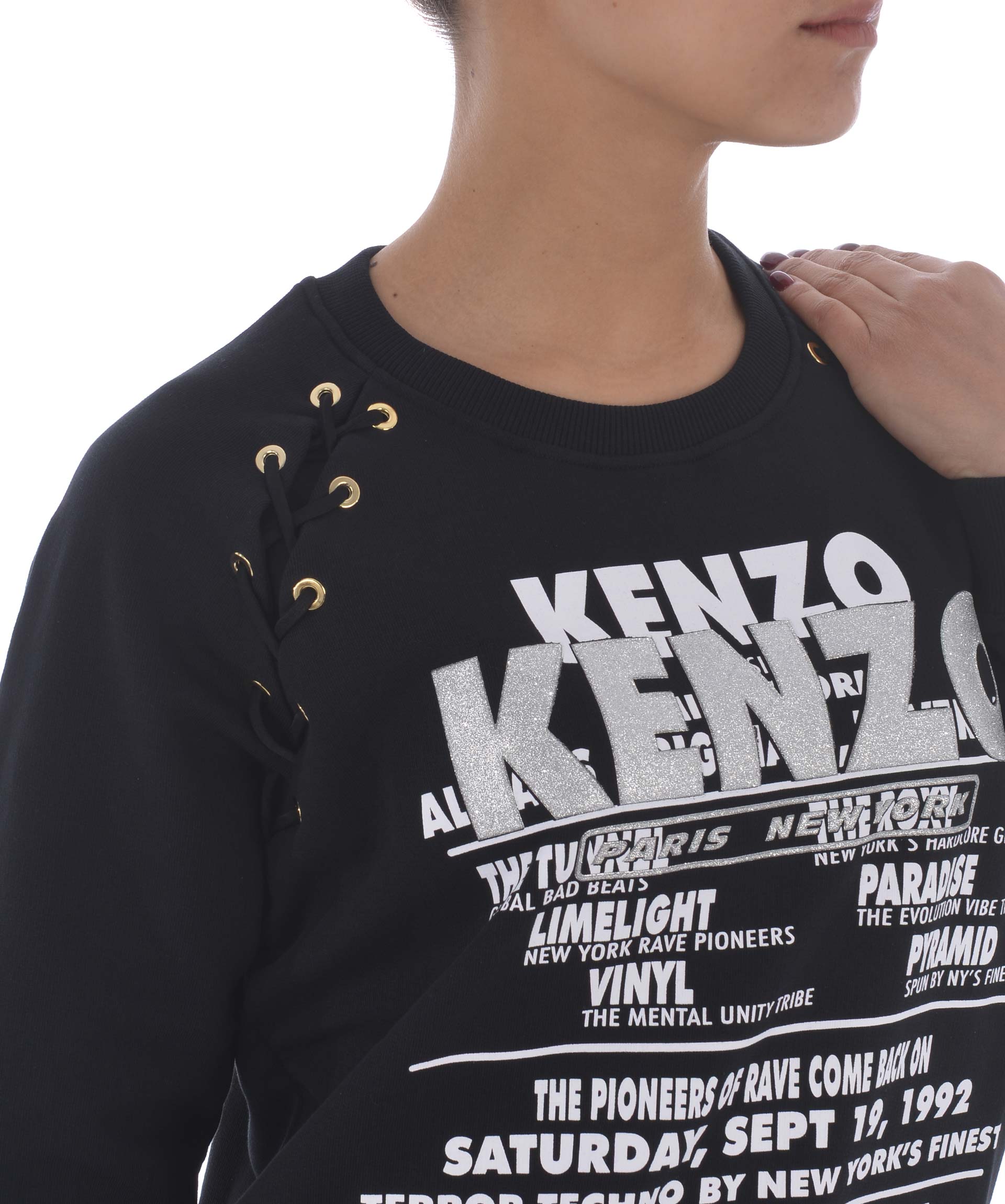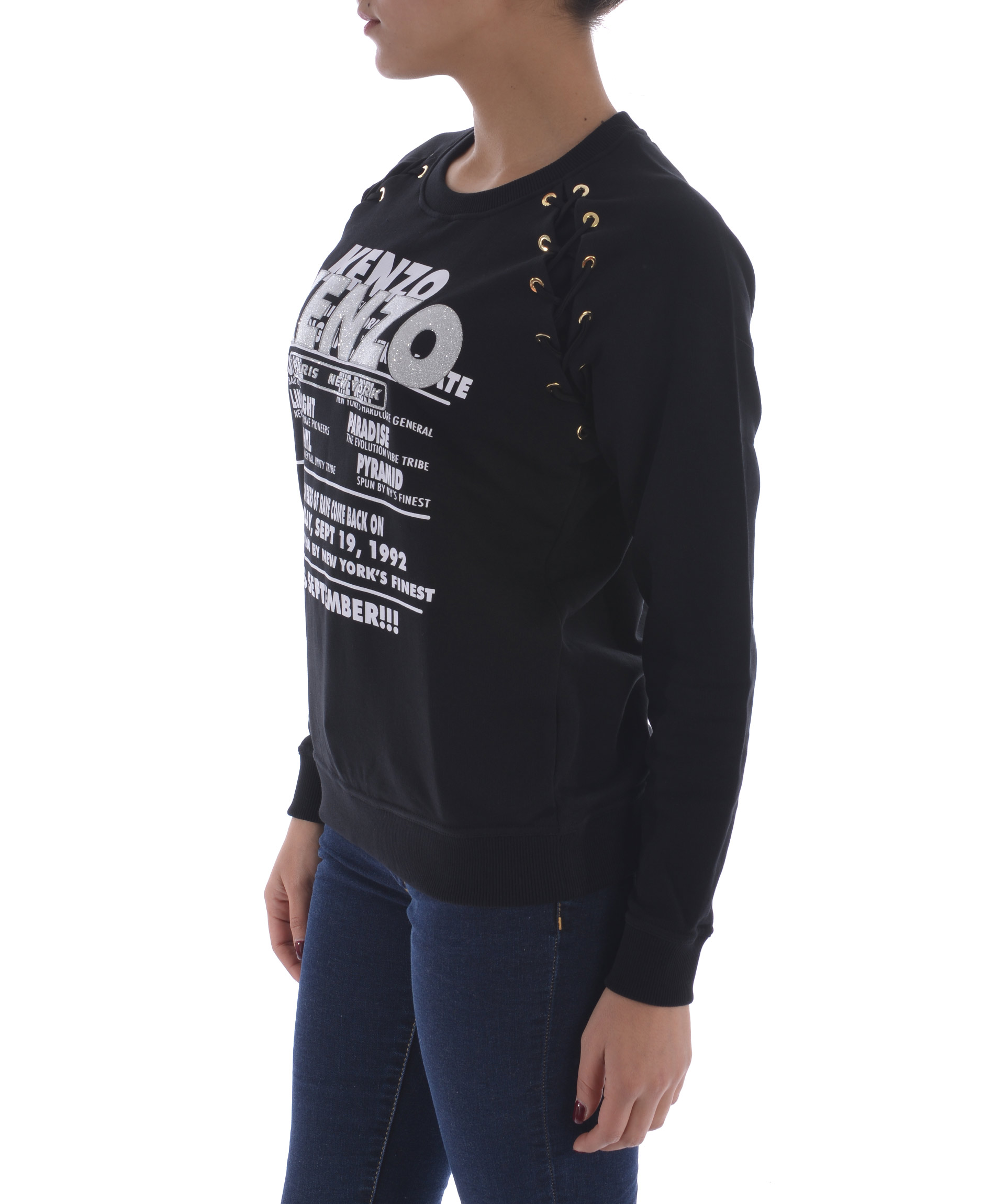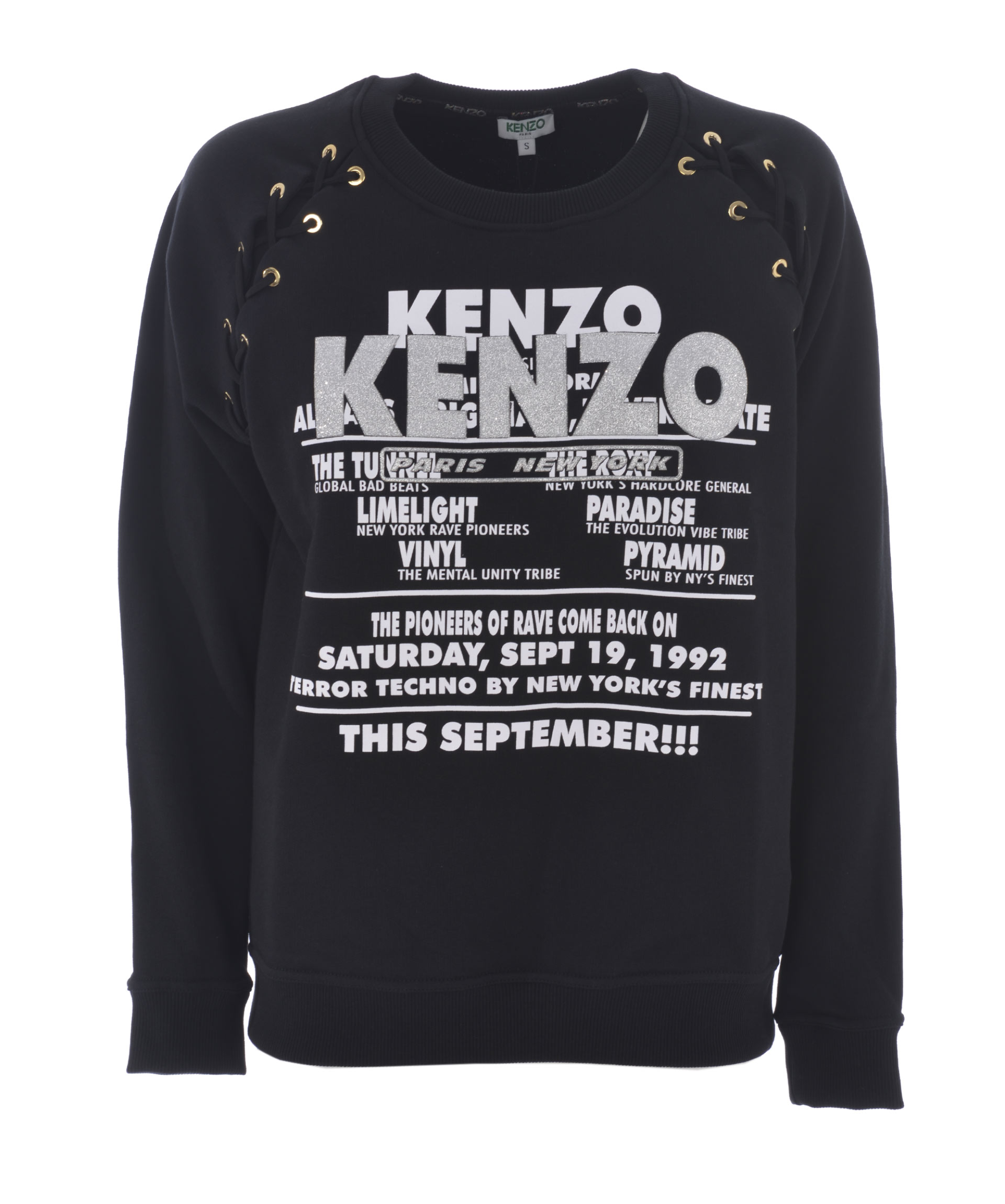 Felpa Kenzo in cotone Nero. Stampa frontale e logo lettering in glitter Argento. Girocollo a costine. Manica lunga raglan con laçage. Polsi e fondo a costine. Misura in foto S 100% cotone