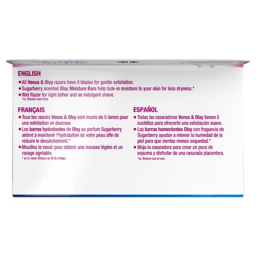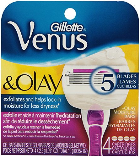 -. Feature : Olay Moisture Bars release skin conditioners to help lock in moisture to your skin for less dryness* *vs. Venus Breeze over time / Easy-to-change razor cartridges / Hang razor on the in-shower storage holder to air dry between uses / All Venus razor cartridges fit all Venus razor handles / 5 razor blades for a close, smooth, long-lasting shave