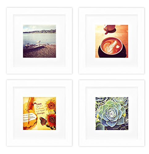 Golden State Art, Smartphone Instagram Frames Collection, Set of 4, 6x6-inch Square Photo Wood Frames with White Photo Mat & Real Glass for 4x4 photo, White