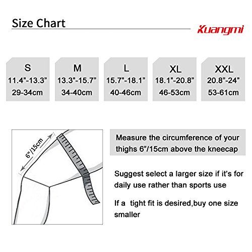 ✅SIZE:Pls check the size chart before your order,measure the circumference of your thighs 6”(15cm) above the kneecap,S:11.4-13.3”,M:13.3-15.7”,L:15.7-18.1”,XL:18.1-20.8”,XXL:20.8-24”☞TIPS:If it tends to folds in the back of the knee,roll up at the top,slide down,not compression&support at all happened,it means the size you choose was too big.If item is Fulfilled by Amazon,you can ask Amazon to replace.If the item is sold by KuangmiSport,Pls contact us,we’ll exchange if you’re having size problem