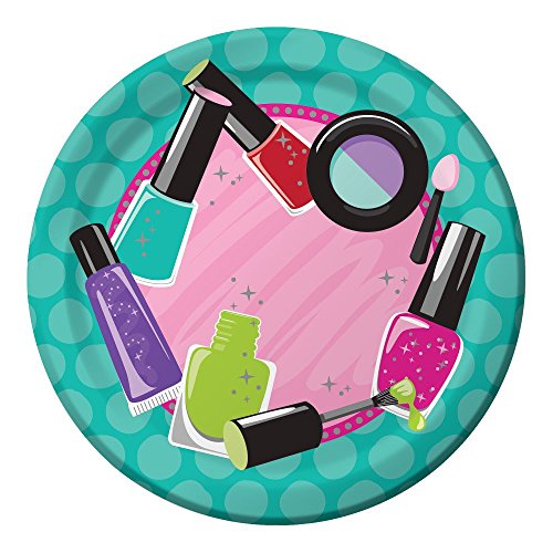 -. Feature : Magenta and aqua product bundle includes: 8 dinner plates, 8 dessert plates, 16 napkins, 8 hot/cold cups & 24 piece magenta silverware / Dinner plates measure 8 3/4" round with lipstick, nail polish, and eye shadow design / Dessert plates measure 6 7/8" round / Products feature Sparkle Spa Party theme / Disposable tableware for a girl's birthday party!