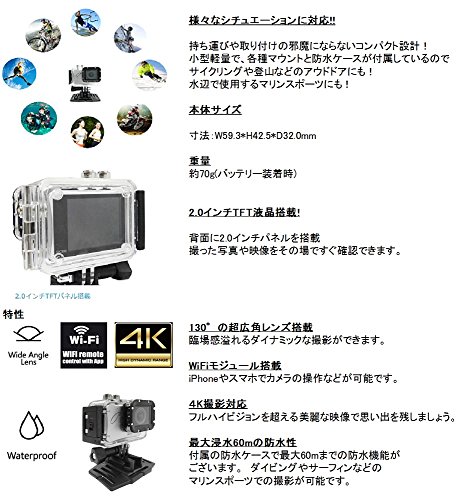 ●해상 도1080p60의 영상으로 기록에 옵니다.●부속 방수 케이스가 있기 때문 마린 스포츠나 윈터 스포츠로도 사용하실 수 있습니다!●소형인 바디와 각종 마운트 부속이기 때문에 여러가지 곳에 장착 가능합니다.●스포츠 아웃도어에!