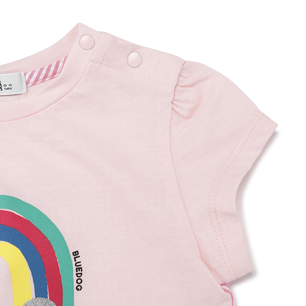 무지개 포인트 나염이 들어간 귀여운 여자라인의 티셔츠입닌다. 등판에 시원한 STRIPE우븐이 매치되어 산뜻한 느낌을 주며