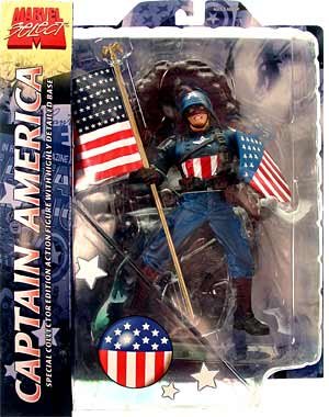 Studio : Marvel Select Publisher : Marvel Select Binding : Toy Product Description A Diamond Select Release! Toy Biz and Diamond Select join forces to take a crack at the first character from the runaway Marvel hit, The Ultimates! Sculpted by Shawn Nagle, this new action figure measures 7" in height and is based on the 1945-look of Captain America as featured in the first issue of The Ultimates. The figure comes complete with a brick wall base, an American flag, and a removable helmet and bandolier. Highly detailed and featuring limited articulation, this figure will not be available in mass-market outlets, and is meant for the discriminating Marvel collector. All Marvel Select figures are in scale with one another and can be displayed with other Marvel Select figure accessories if desired. Captain America is the fourth figure in Diamond Select's line of monthly specialty market figures! Deluxe blister card packaging. 0