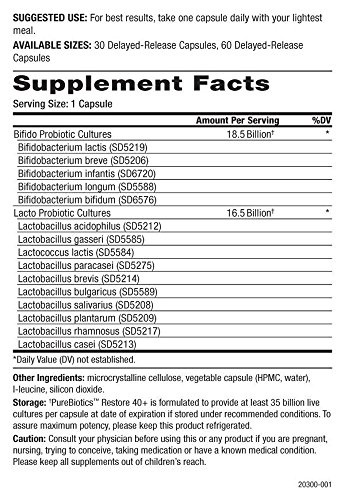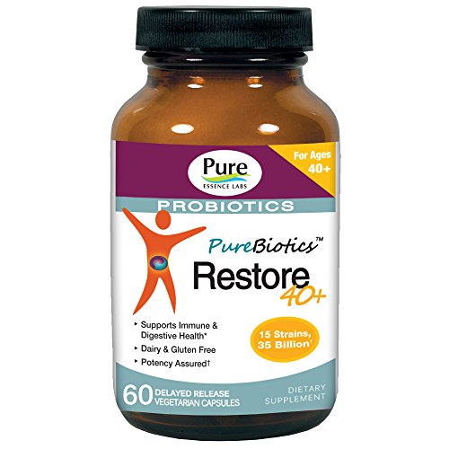 PureBiotics Restore 40+ by Pure Essence Labs - To Support Digestion and Immune Health Probiotics are helpful bacteria that support digestion and immune function and produce active forms of B-vitamins. The most common types are Lactobacilli and Bifidobacteria. Within each type are many strains that confer health benefits when present in sufficient amounts. PureBiotics formulations contain only the most studied and stable strains of probiotics. Each formula provides guaranteed culture counts of 12 to 15 strains. The balance between Lacto and Bifido cultures varies depending on each formula's purpose. Research shows that levels of Bifidobacteria decline with age. However, both Bifido and Lacto cultures are depleted by chlorinated water (including baths and showers), oral contraceptives, antibiotics, x-rays, alcohol, diabetes, ultrasounds, parasites, etc. It is virtually impossible to avoid probiotic depletion in the modern world. The healthy human gut is home to about 100 trillion living probiotic cultures. At 30 billion cultures, it would take over 9 years to replace your entire population. We believe at least 30 billion cultures per day are needed to insure sufficient probiotic replenishment. PureBiotics Restore 40+ includes 15 probiotic strains (35 billion active cultures per capsule) to support digestion and immune health. The balance is about 50% bifido and 50% lacto cultures. It is a bit stronger than Restore because those age 40 and older typically have greater depletion than younger people. It is perfect for offsetting the normal depletion that occurs through time, and is designed for men and women aged 40 and up. Regain Control Of Your Digestive Health! Get PureBiotics Restore 40+ Today!Feature