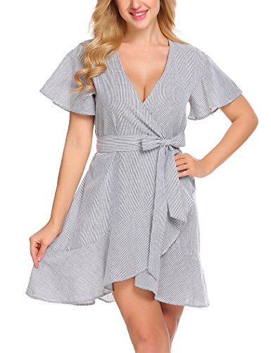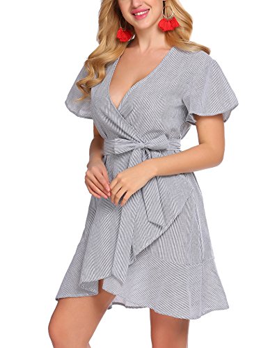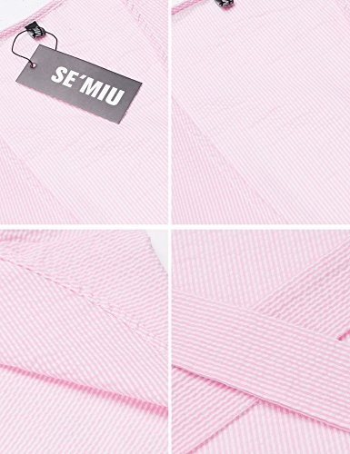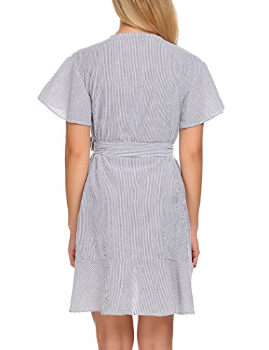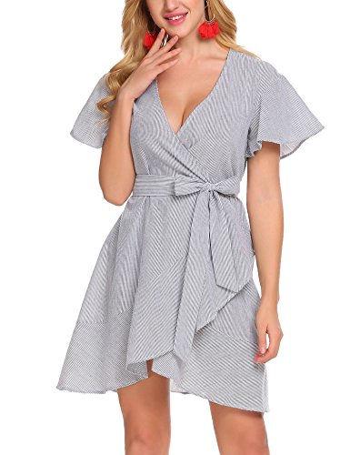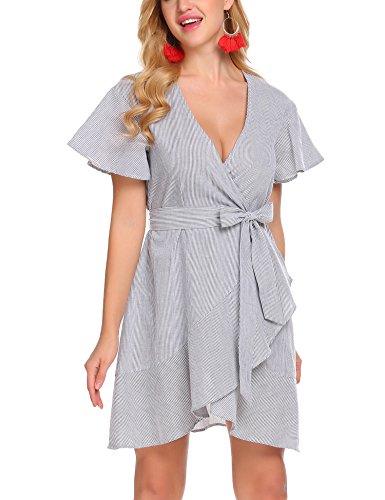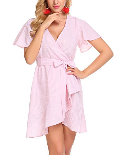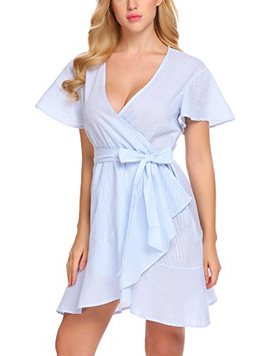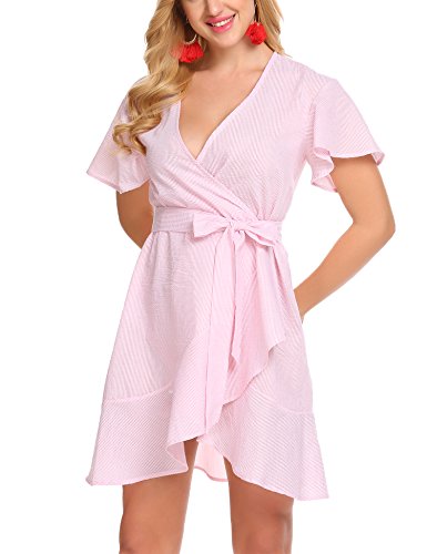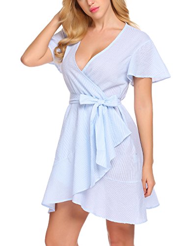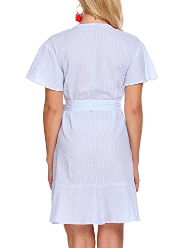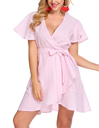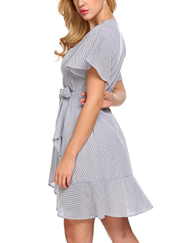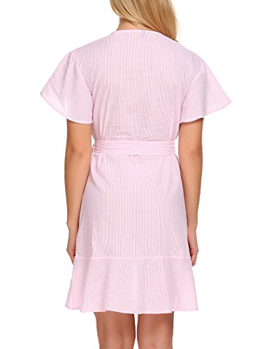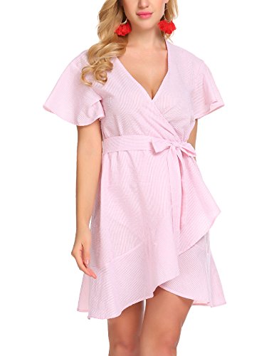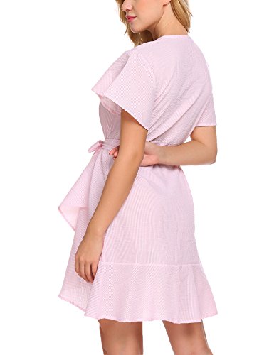 Product name: SE MIU Womens Plain Long Sleeve Ruffles Loose Swing Halloween Casual T Shirt Dress Brand: SE MIU Material: 95% Cotton, 5% Spandex 3 Colors: Pink, Light Blue, Gray Collar: Wrap Sleeve Type: Flare Sleeve Sleeve: Short Sleeve Length: Above Knee, Mini Pattern: Striped Decor: Belt Season: Spring, Summer Occasion: Casual Garment Care: Washing max 40℃, Hang to dry. Good quality fabric, and making style make you feel good and comfortable when wearing. Our Model Information: Height 175cm, Bust 90cm, Waist 60cm, Hip 90cm.
