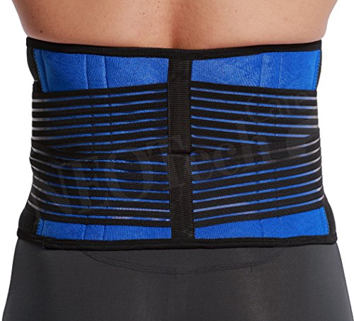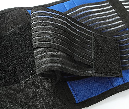 Neoprene Lumbar Support with Double Banded Strong Compression Pull Straps, Waist / Lower Back Brace, NEOtech Care ( TM ) Brand - Black & Blue Color -...