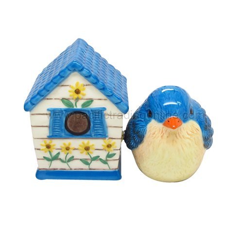 Hand Painted Ceramic Magnetic Salt and Pepper Shaker Set- Bird and Birdhouse