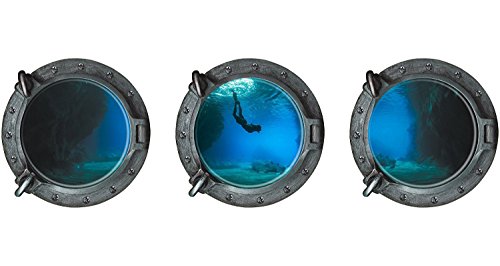 Dnven (13"w X 13"h X 3pcs) Set of 3 3D Porthole Undersea Underwater Diving Window View Faux Submarine Window Partial Frosted Frosting Murals Wall Decals Removable Wall Stickers for Bedrooms