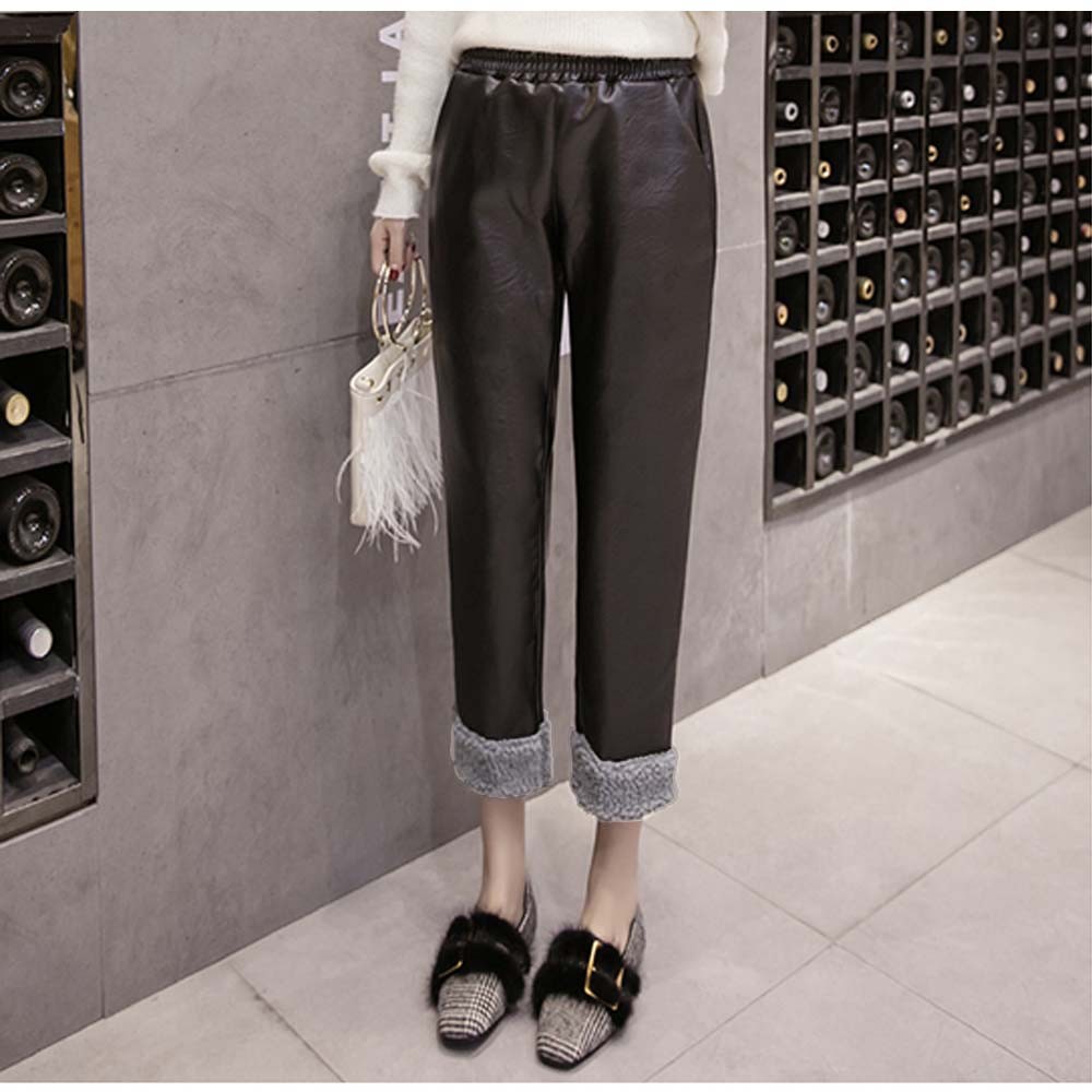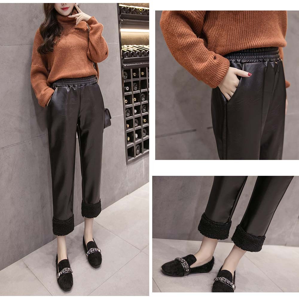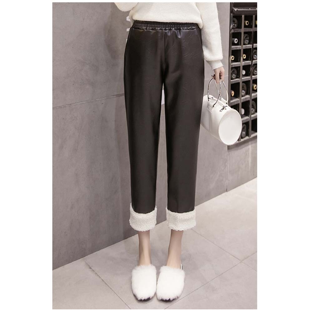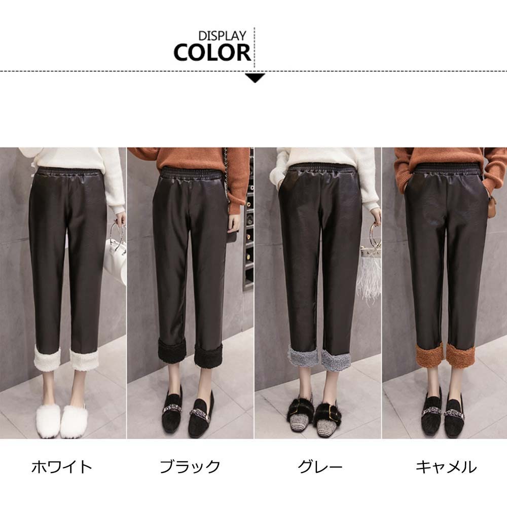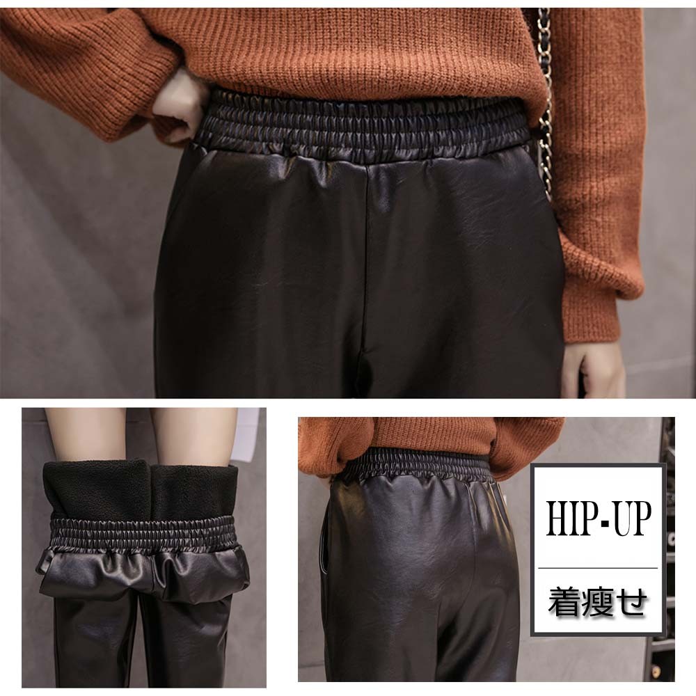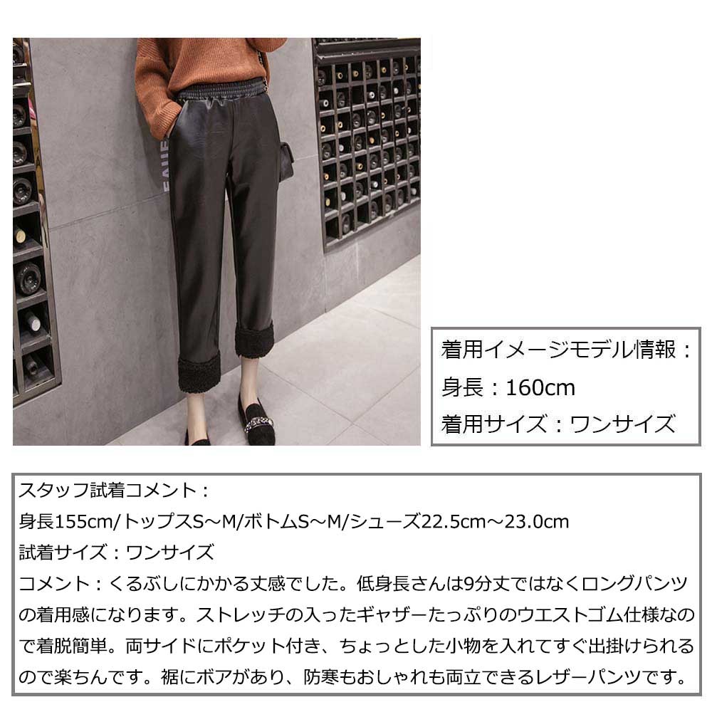 美脚シルエットの裏起毛仕様裾ボアレザーパンツ